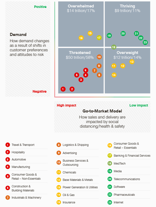 Graf zachycuje jednotlivé sektory rozdělené podle toho, jak je ovlivnila poptávka (vertikální osa) a protiepidemická opatření (horizontální osa). Turismus a doprava se nachází pod číslem 1 v levém dolním rohu grafu, který obsahuje nejhůře zasažená odvětví.