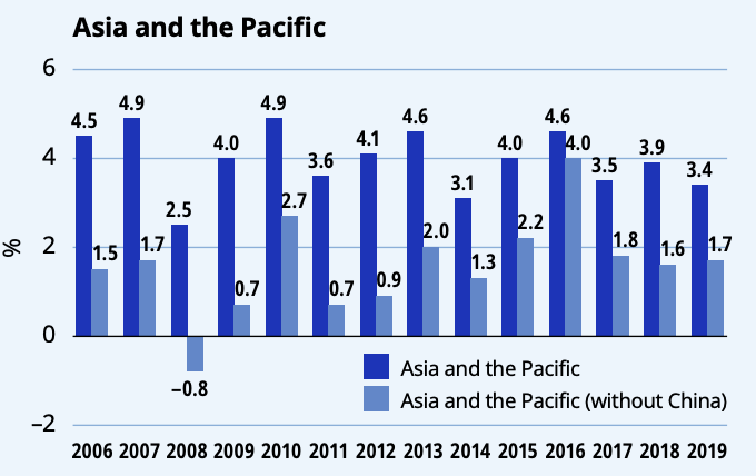 Mezinárodní organizace práce (International Labour Organisation, ILO), která spadá pod OSN, vydala v prosinci 2020 zprávu (.pdf), v níž zmiňuje, jak pandemie covidu-19 zpomalila růst mezd v oblasti Asie a Pacifiku. ILO uvádí (str. 32), že mezi lety 2006 a 2019 rostly v oblasti Asie a Pacifiku reálné mzdy v průměru o 3,97 % ročně, nejvyšší nárůsty ILO zaznamenala v letech 2007 a 2010.