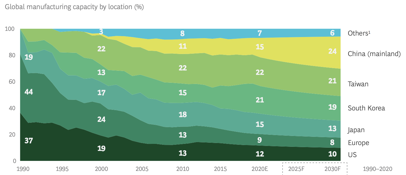 Podle dat Boston Consulting Group (BCG) a Semiconductor Industry Association (.pdf, str. 7) se výroba za posledních 30 let přesunula z „tradičních“ mocností (Evropa, USA) do Asie. Největšími asijskými, ale také světovými producenty polovodičů jsou Tchaj-wan, Jižní Korea a Čína.